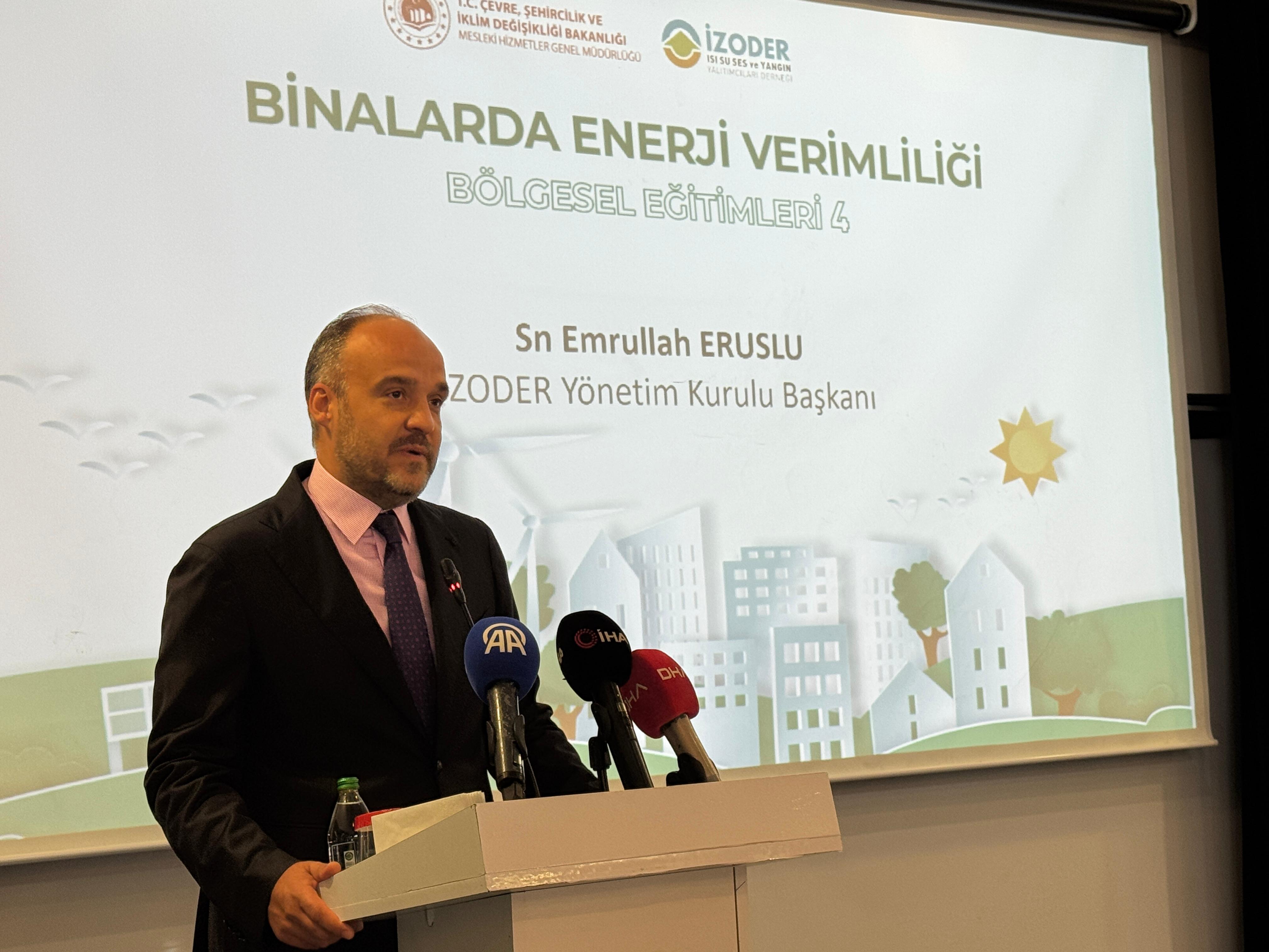Konuşmaların ardından binalarda enerji verimliliği ile ilgili yapılan yasal düzenlemeler, standartlar ve güncellenen uygulamalar hakkında bilgi vermek amacıyla düzenlenen eğitimlere geçildi. Amasya, Çorum, Giresun, Kastamonu, Ordu, Rize, Samsun, Sinop, Sivas, Tokat, Trabzon’dan ilgili idarelerin ruhsat ve yapı kullanma izin birimleri, ilgili meslek odaları, yapı denetim kuruluşları, malzeme üreticileri ve proje müelliflerinin katıldığı bölgesel eğitimlerde, Genel Müdürlüğümüz Enerji Verimliliği ve Tesisat Dairesi Başkanı Hüseyin Namım Sandıkcı, Enerji Verimliliği Şube Müdürü Necip Ayas ve İZODER Genel Sekreteri Timur Diz; Binalarda Enerji Verimliliği Mevzuatı ve TS 825 Binalarda Isı Yalıtımı Kuralları Standartları konusundaki yenilikler ile yalıtımın diğer uygulama alanları ve yeşil bina sertifikası hakkında bilgiler verdi.