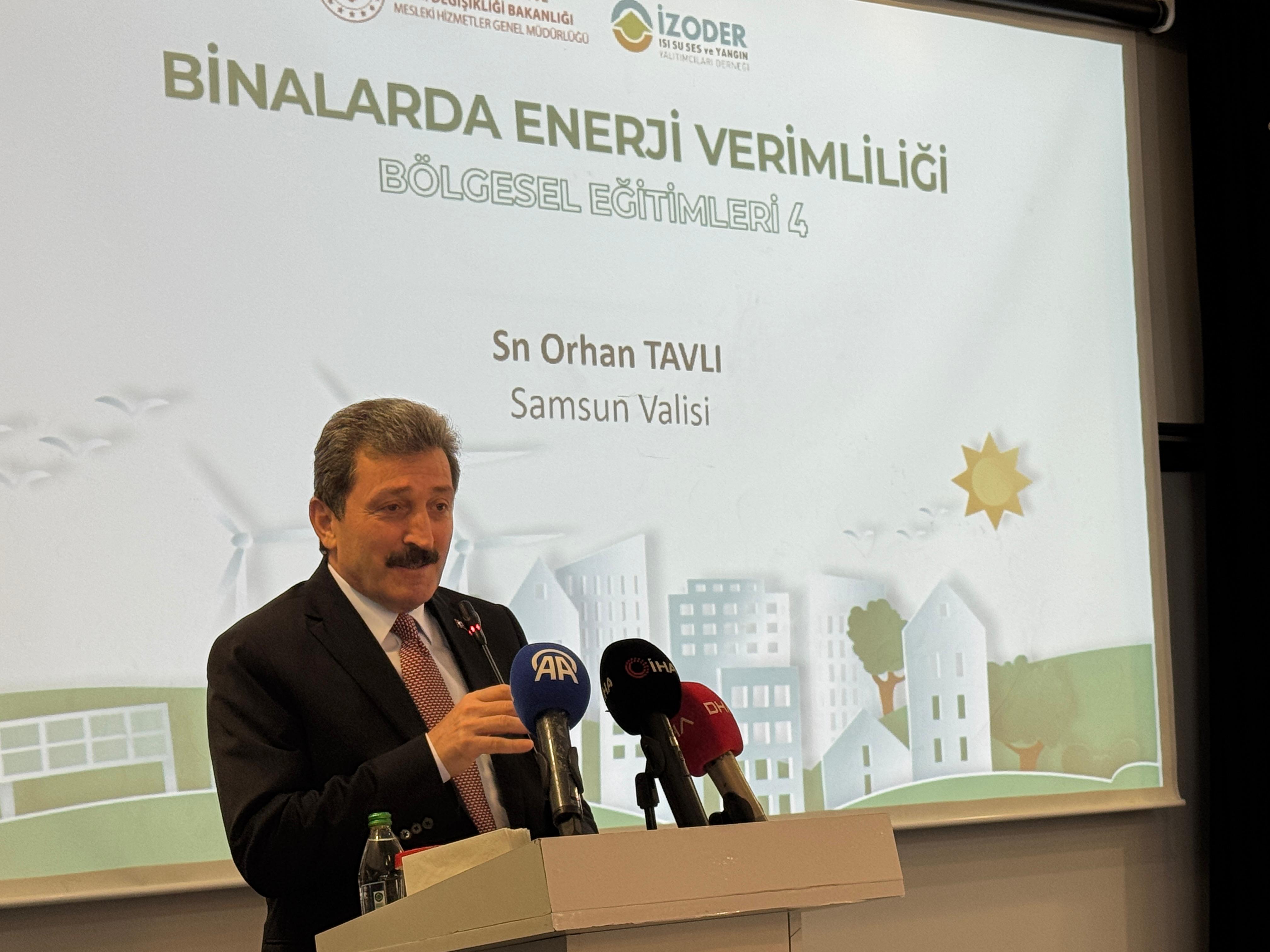 Samsun Valisi Orhan Tavlı da konuşmasında, enerji verimliliğinin yalnızca ekonomik bir tercih değil, aynı zamanda sorumluluk ve toplumsal bir zorunluluk olduğunun altını çizerek, “Enerjiyi verimli kullanmak hem bireysel hem de ulusal ekonomimize katkı sağlarken, aynı zamanda Türkiye Yüzyılı’nın teminatı olarak gördüğümüz gelecek nesillerimize daha yaşanabilir bir çevre ve dünya bırakmamızın da en önemli yollarından biridir diye değerlendiriyoruz. Saygıdeğer Cumhurbaşkanımızın liderliğinde Çevre, Şehircilik ve İklim Değişikliği Bakanlığımız tarafından da önemli düzenlemelerin hayata geçirildiğini, sanayi sektöründen sonra enerjinin en çok tüketildiği alan olan binalarımızda da yenilikçi bir yaklaşımla, sahip olunan konfor şartlarının daha az enerji tüketimiyle temin edilebilmesine yönelik düzenlemeler için gayret gösterildiğini de memnuniyetle müşahede ediyoruz. Huzurlarınızda başta Sayın Çevre, Şehircilik ve İklim Değişikliği Bakanımız olmak üzere Sayın Genel Müdürümüze, İZODER’e ve ekibine teşekkür ediyoruz” ifadelerini kullandı.