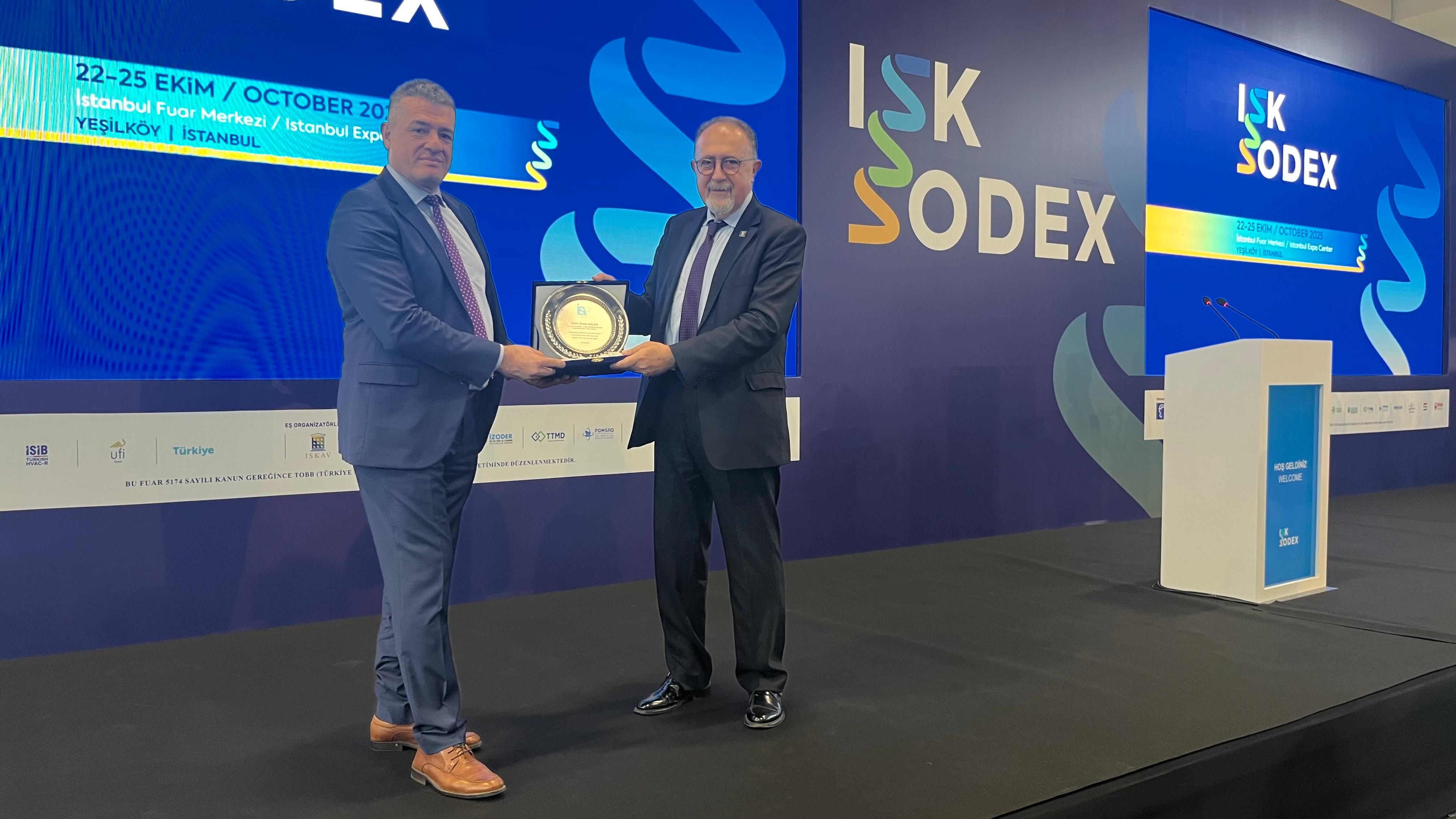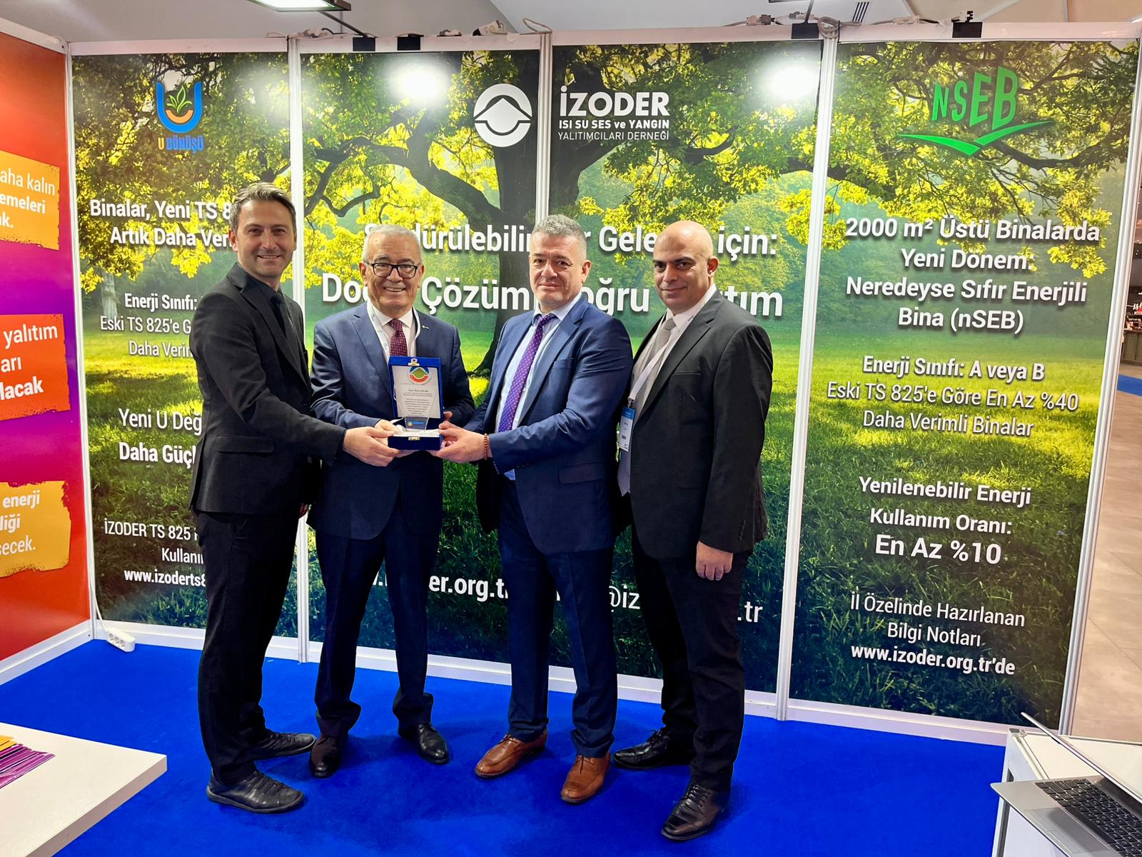 ISK-SODEX 2025 Fuarı’nda ayrıca Isı, Su, Ses ve Yangın Yalıtımcıları Derneği (İZODER) tarafından da, binalarda enerji verimliliğine yönelik güncellen mevzuat çalışmaları ve bu çalışmaların toplumsal farkındalığa aktarılmasına yönelik katkılarımız dolayısıyla, Genel Müdürlüğümüze teşekkür plaketi verildi. Teşekkür plaketi, İZODER Başkan Yardımcısı Ertuğrul Şen tarafından, Genel Müdürlüğümüz adına Enerji Verimliliği ve Tesisat Dairesi Başkanımız Hüseyin Namık Sandıkcı ve Şube Müdürümüz Necip Ayas’a takdim edildi.